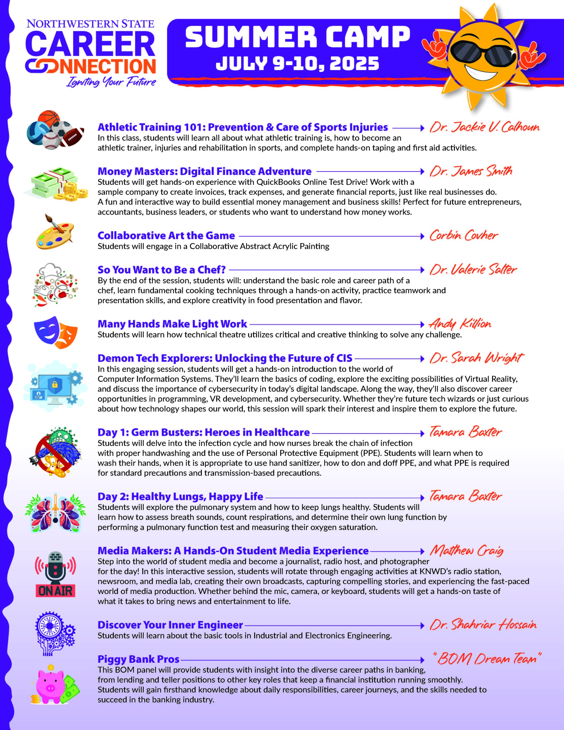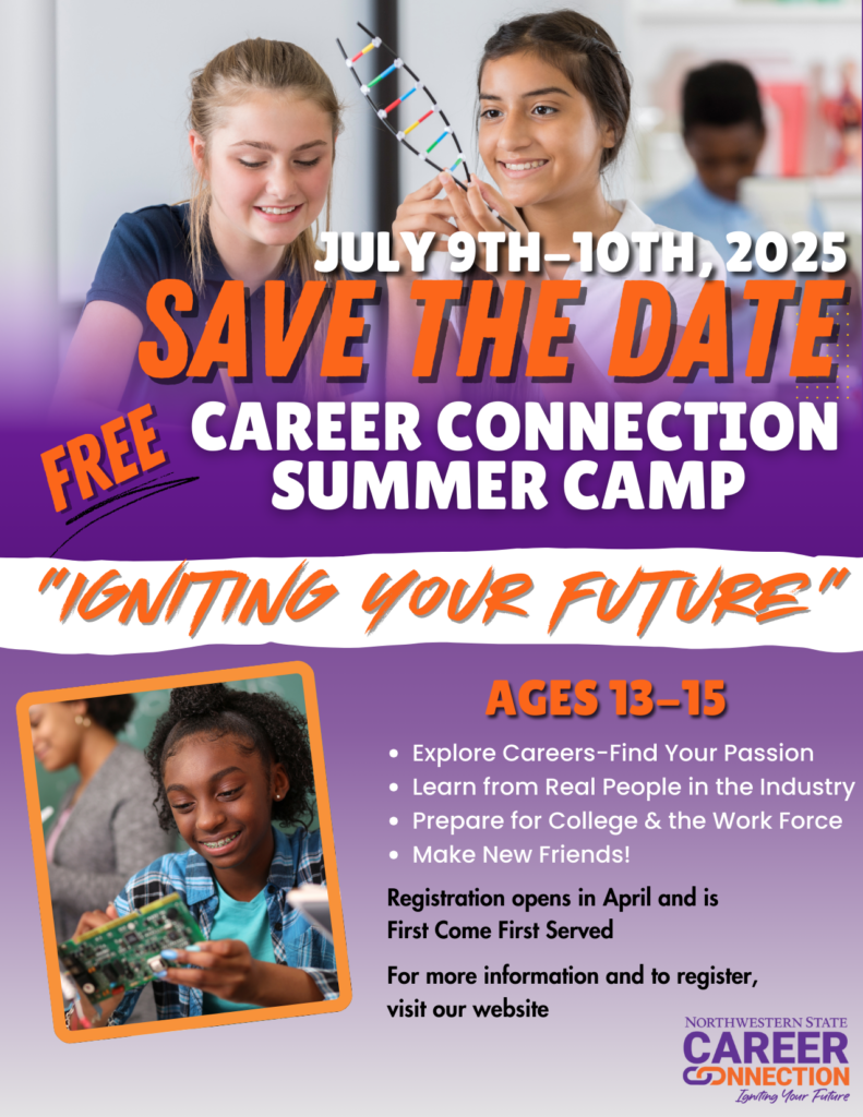 Career Connection is a great opportunity for students ages 13-15 to explore some of the exciting hands-on education experiences offered at Northwestern State University. This innovative summer program connects students with hands-on learning experiences across various academic disciplines and career paths, fostering early career exploration and academic engagement.