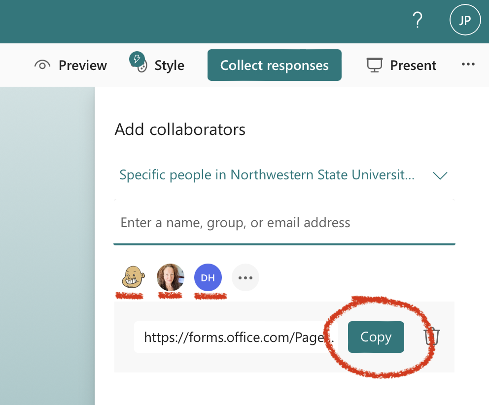 7. Beneath the “Enter a name, group, or email address” field you should see icons for each of the people you have added (fig. b2). Beneath the icons is a select field with a “Copy” button. Here you can copy the URL to email to the individual(s) you have selected as Collaborator. Once the link is delivered, they must input the URL into a web browser and will thereafter have editorial access to your form.