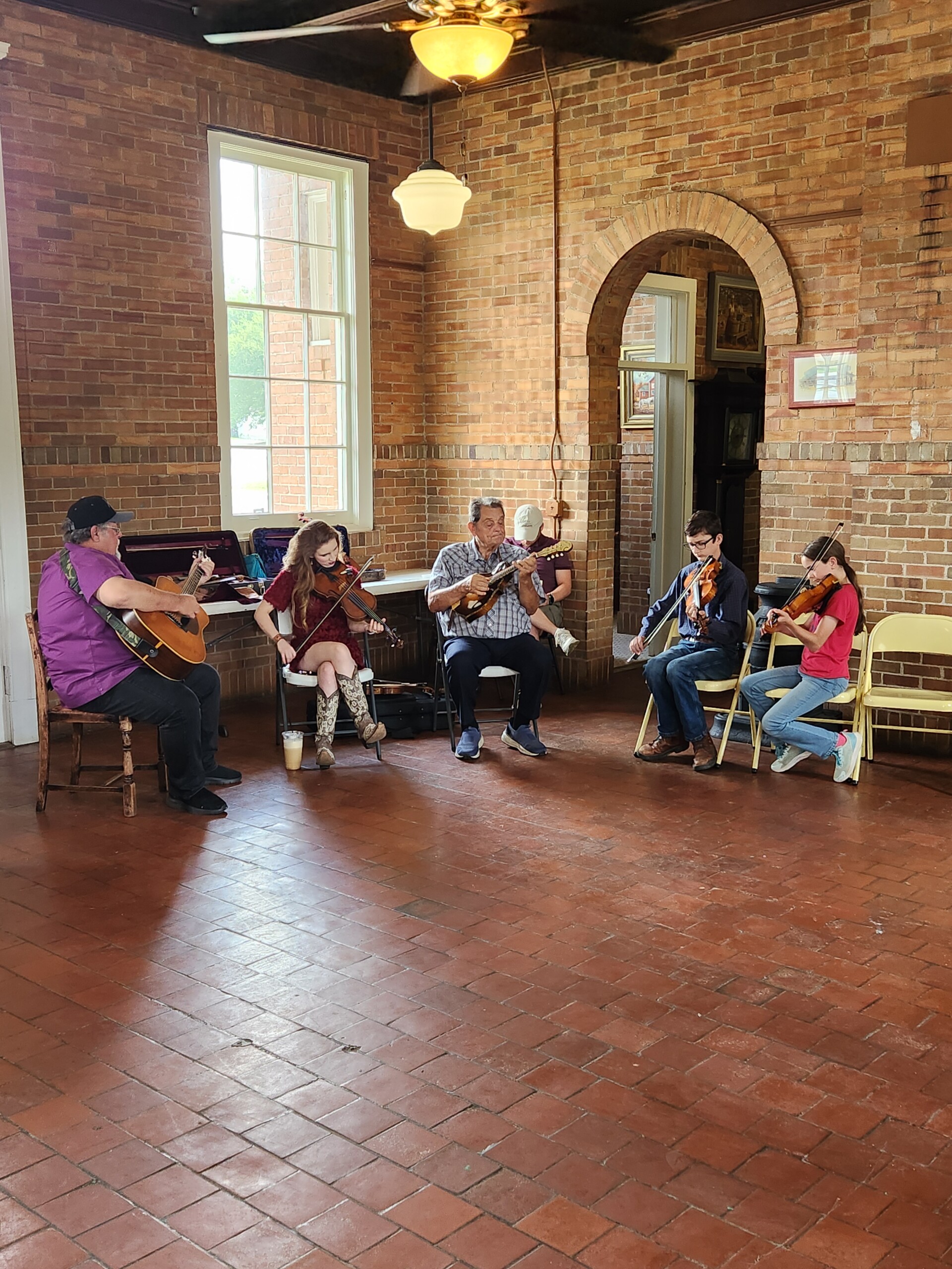 Participants in the Louisiana Folklife Center program “Fiddlin’ with the Finest! A Celebration of Louisiana Folk Fiddling” on Saturday at the Many Depot Museum in Many included, from left, Joe Suchanek, Clancey Stewart, Ron Yule, Samuel O’Kelley and Sarah O’Kelley.