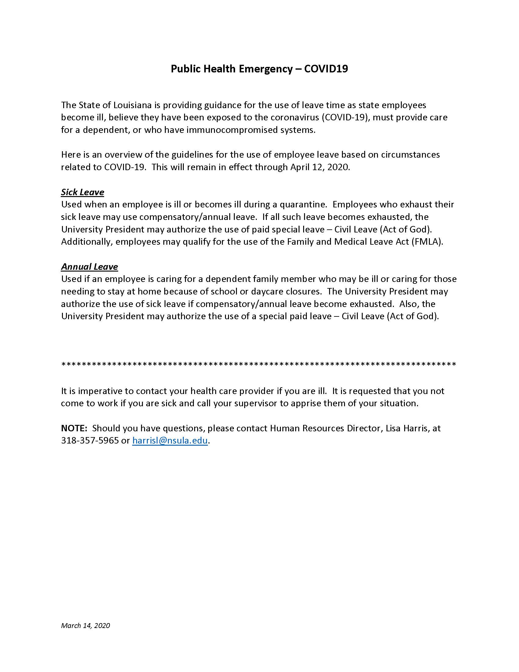 Also, based on Gov. Edwards’ proclamation (25-JBE-2020) and Commissioner Dardenne’s March 13 memorandum, we have developed information found in the “Leave Time” (posted above) to address your questions and concerns regarding the use of leave. Should you need additional information after reviewing these guidelines, please contact Lisa Harris, Human Resources Director, at 318-357-5965 or harrisl@nsula.edu.
